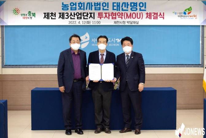 충북 제천시는 금일(12일) 제천시청에서 농업회사법인 태산명인(대표이사 강명인)과 제3산업단지 공장 신설 위한 투자협약을 체결했다.