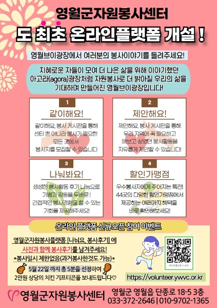 오픈일로부터 5월 22일까지 약 4주간 온라인플랫폼 오픈 이벤트를 진행하며 자세한 내용은 영월군자원봉사센터 공식 홈페이지와 플랫폼을 방문하면 알 수 있다. 아래는 플랫폼 접속 QR코드로 카메라로 스캔 시 접속이 가능하다.
