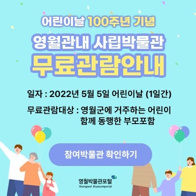 (사)영월박물관협회장은 관내 다양한 테마의 박물관이 있다는 인프라를 적극 활용하여, 16가지의 박물관별 특색을 멀리 나가지 않더라도 쉽게 경험해 볼 수 있다는 박물관고을 특구 영월만의 장점을 미래의 주역인 어린이들이 누리고 꿈과 희망을 심어줄 수 있는 기회가 되길 바란다며, 이번 어린이날 100주년 기념 무료관람 행사를 추진한다고 밝혔다.