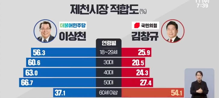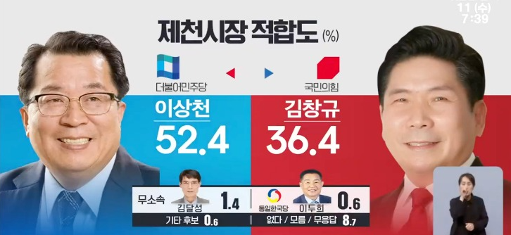 이번 KBS 청주방송국에서 실시한 여론조사에 따르면 더불어민주당 이상천 후보가 52.4%, 국민의힘 김창규 후보는 36.4%로 이 후보가 16.0% 더 앞 서고 있는 것으로 나타났다.