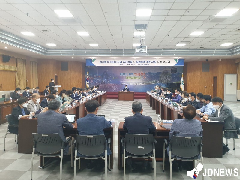 충북 제천시는 지난 12일 제천시청 청풍호실에서 박해운 시장 권한대행 주재로, 국・단・소장 및 36개 사업추진 부서장들이 참석한 가운데 심사분석 100대 사업 추진상황 보고회를 갖고 시정 현안사업에 대한 추진상황 등을 점검했다.