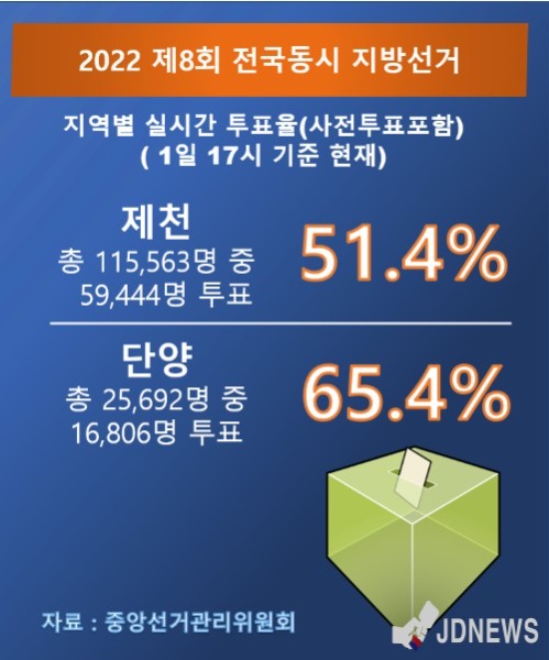 6·1 지방선거 제천·단양 오후 5시기준 투표율 유소진 기자 발행 2022-06-01 17:04 Facebook Twitter band 네이버블로그 카카오스토리 카카오톡 글자작게 글자크게 ▲ JDnews 류기복 디자이너 <저작권자 ⓒ JD뉴스코리아, 무단 전재 및 재배포 금지> 유소진 기자 다른기사보기