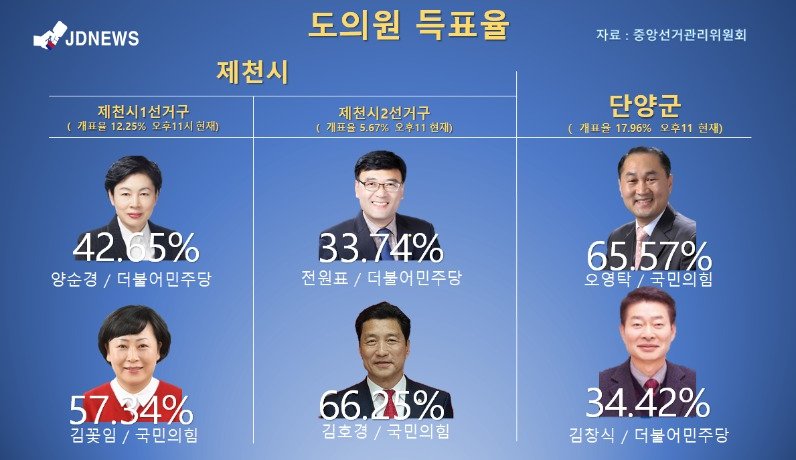 제천・단양 충북도의원 선거 밤 11시기준 개표진행 상황 유소진 기자 발행 2022-06-01 23:07 Facebook Twitter band 네이버블로그 카카오스토리 카카오톡 글자작게 글자크게 ▲ JDnews 류기복 디자이너 <저작권자 ⓒ JD뉴스코리아, 무단 전재 및 재배포 금지> 유소진 기자 다른기사보기
