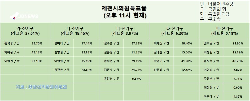 밤 11시 기준, 제천시의원 각 선거구 개표진행 상황 유소진 기자 발행 2022-06-01 23:11 Facebook Twitter band 네이버블로그 카카오스토리 카카오톡 글자작게 글자크게 ▲ JDnews 류기복 디자이너 <저작권자 ⓒ JD뉴스코리아, 무단 전재 및 재배포 금지> 유소진 기자 다른기사보기