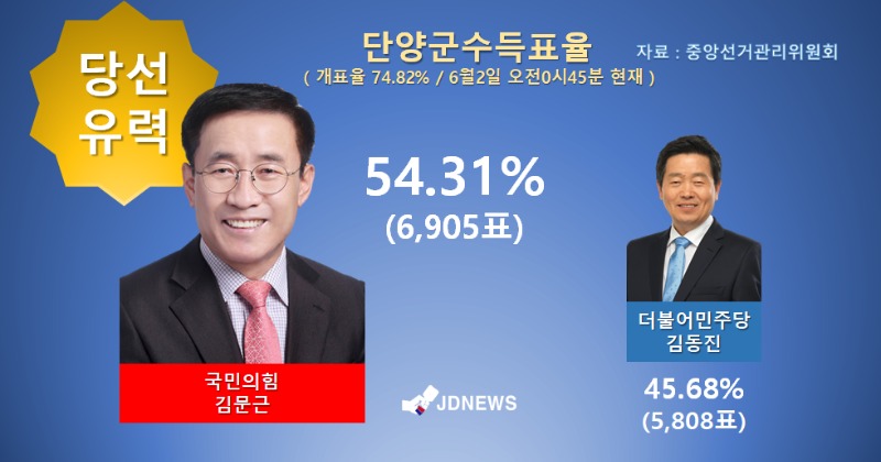 0시 45분 현재 단양군수 선거 국힘 '김문근' 유력! 유소진 기자 발행 2022-06-02 00:47 Facebook Twitter band 네이버블로그 카카오스토리 카카오톡 글자작게 글자크게 <저작권자 ⓒ JD뉴스코리아, 무단 전재 및 재배포 금지> 유소진 기자 다른기사보기
