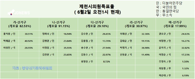 '오전 1시기준' 제천시의원 각 선거구 개표진행 상황 유소진 기자 발행 2022-06-02 01:04 Facebook Twitter band 네이버블로그 카카오스토리 카카오톡 글자작게 글자크게 <저작권자 ⓒ JD뉴스코리아, 무단 전재 및 재배포 금지> 유소진 기자 다른기사보기