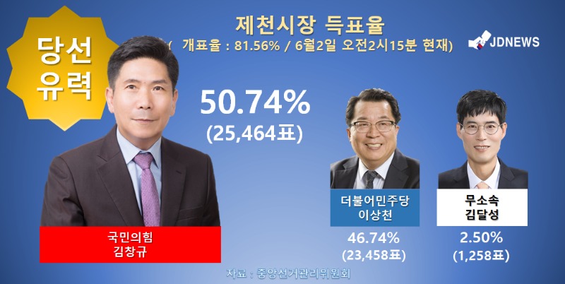 오전 2시 15분 현재 제천시장 선거 국힘 '김창규' 당선 유력! 유소진 기자 발행 2022-06-02 02:13 Facebook Twitter band 네이버블로그 카카오스토리 카카오톡 글자작게 글자크게 <저작권자 ⓒ JD뉴스코리아, 무단 전재 및 재배포 금지> 유소진 기자 다른기사보기
