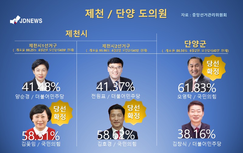 제천・단양 충북도의원 선거 '오전 2시 40분 현재' 개표진행 상황 유소진 기자 발행 2022-06-02 02:44 Facebook Twitter band 네이버블로그 카카오스토리 카카오톡 글자작게 글자크게 <저작권자 ⓒ JD뉴스코리아, 무단 전재 및 재배포 금지> 유소진 기자 다른기사보기