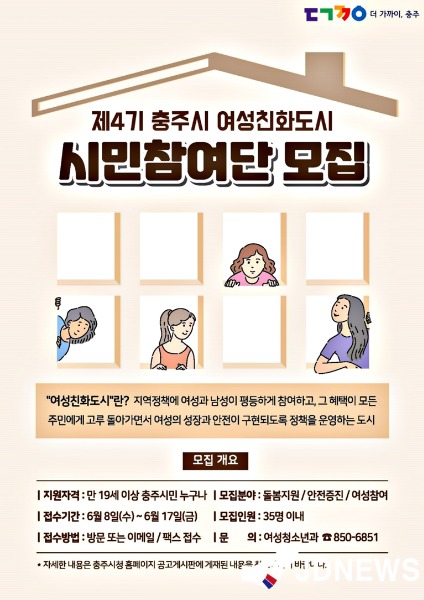 모집인원은 35명 이내로 양성 평등정책 및 생활환경 개선사업에 관심 있고 여성친화도시 조성 사업에 적극 참여할 수 있는 만 19세 이상 충주시민이라면 누구나 지원 가능하다.