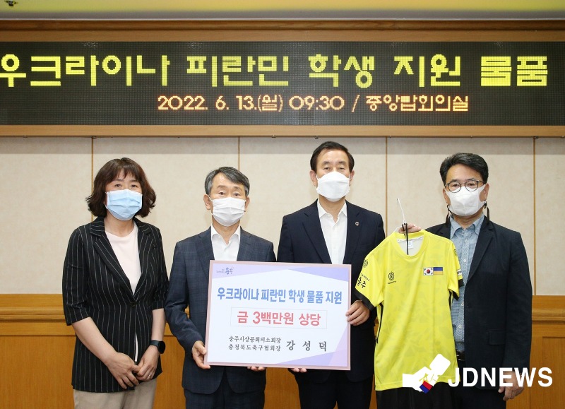 시는 13일 강성덕 충주시상공회의소 회장이 시청을 방문해 러시아의 우크라이나 침공에 따른 피해자 학생들을 위한 축구복 18벌 및 축구용품 등 300만 원 상당의 물품을 기탁했다고 밝혔다.