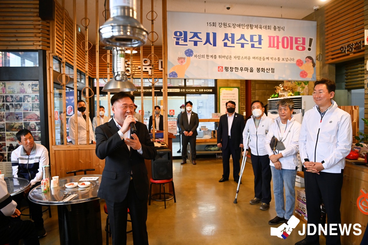 강원 원주시가 6월 15일 오전 11시 30분 평창한우마을 봉화산점에서‘제15회 강원도장애인생활체육대회 출정식’을 개최했다.