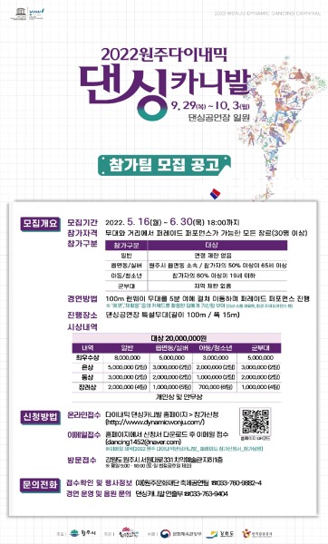 이에 (재)원주문화재단은 9월 29일부터 10월 3일까지 5일간 원주 댄싱공연장 특설무대 및 원주시 일원에서 열리는 경연 참가팀을 6월 30일까지 모집한다.