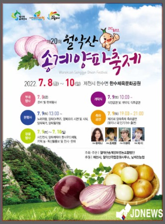 신종 코로나바이러스 감염증(코로나19)로 인해 2년여 동안 휴식기에 들었던 양파 직거래 한마당 축제 '제20회 월악산송계양파축제'가 오는 7월 8일부터 10일까지 충북 제천시 한수면 소재 '한수체육문화공원'에서 펼쳐진다.