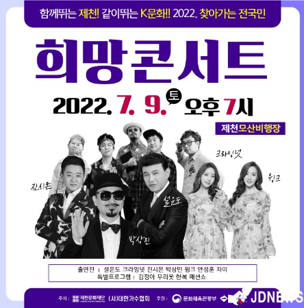 5일 제천문화재단에 따르면 이번 콘서트는 (사)대한가수협회와 공동 주관하고 문화체육관광부, 제천시가 후원하며, 2022 찾아가는 전국민 희망콘서트라는 주제로 오는 7월 9일 저녁 7시 제천 모산비행장 특설무대에서 개최된다고 밝혔다.