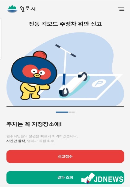 모바일로 시청 홈페이지 팝업 메뉴를 통해 접속하거나 신고 홈페이지(www.wonju.go.kr/kickboard)를 인터넷 주소창에 직접 입력한 후 전동킥보드에 부착된 QR코드를 인식하면 별도 입력 없이 손쉽게 신고할 수 있다.