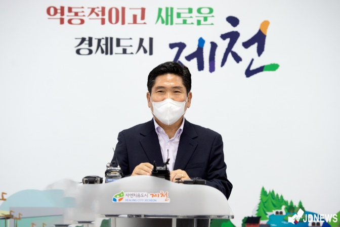김창규 충북 제천시장이 1일 오전 11시 제천시청 브리핑룸에서 민선8기 주요 현안사업 및 시정 현안에 대한 기자회견을 개최했다.