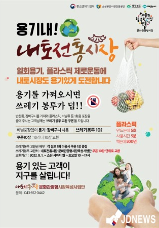 충북 제천시 내토전통시장(상인회장 김정문, 이하 내토시장)은 ‘용기내 프로젝트’를 통해 지구환경을 살리는 플라스틱 제로 운동을 추진한다.