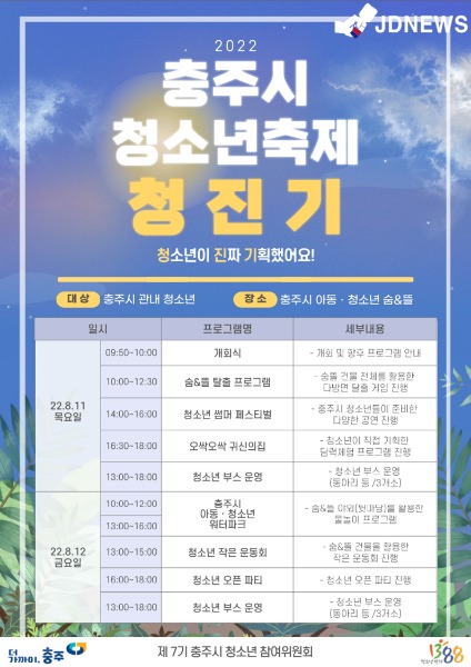 제7기 충주시청소년참여위원회 조용준 위원장(국원고 1)은 “청소년들이 직접 기획하고 운영하는 행사를 개최할 수 있게 도와준 충주시에 감사드린다”며 “앞으로도 충주시의 청소년으로서 활발하게 의견을 제안하고 활동을 펼쳐 나갈 수 있도록 노력하겠다”고 말했다.