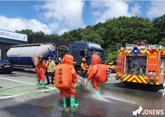12일 오전 10시경 제천시 명지동 인근 한 휴게소에 정차하려던 운송 차량(황산탱크로리 25톤)에서 2리터 가량의 독극물 황산이 도로로 유출됐다.