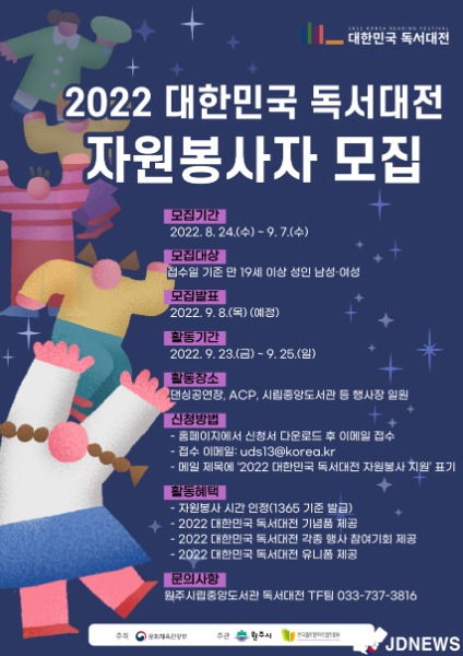 도서관 관계자는 “「2022 대한민국 독서대전」본행사를 성공적으로 이끌어갈 자원봉사자의 많은 참여를 바란다”라고 전했다.
