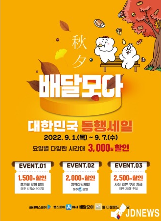 충북 제천형 공공배달앱 '배달모아'가 9월 1일부터 7일까지 신종 코로나바이러스 감염증(코로나19)로 인한 내수 침체를 극복하기 위해 ‘2022년 대한민국 동행세일’에 동참한다.