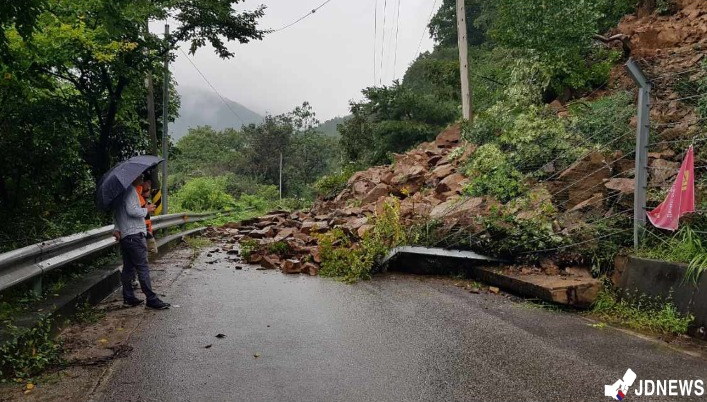 5일 오후 1시 30분경 충북 제천시 금성면 월굴리 지방도로에서 산사태가 발생해 왕복 2차선 도로가 전면 통제됐다.