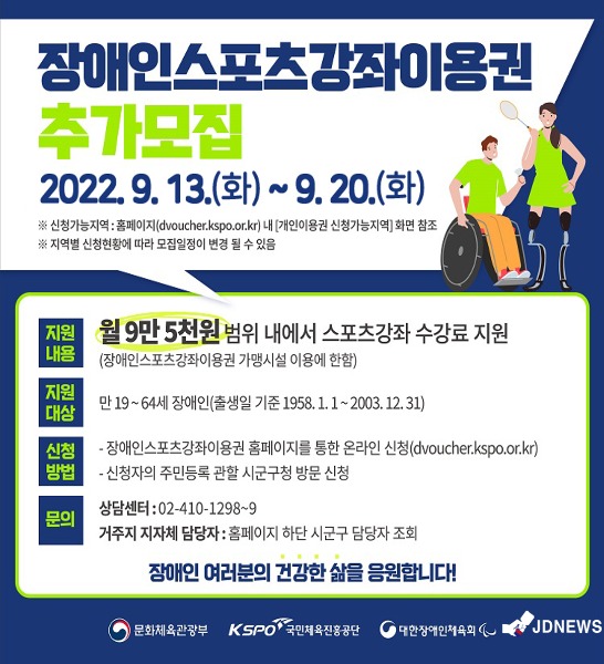 지원 대상은 만 19세~64세 장애인이며, 한시적으로 1만 원이 인상된 월 95,000원의 스포츠 강좌 수강료를 지원한다.