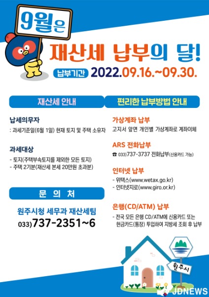납부 기한은 오는 9월 30일까지며, 전국 모든 금융기관에 직접 또는 CD·ATM기, 가상계좌를 이용해 납부하거나 ARS(033-737-3737), 위택스(www.wetax.go.kr), 인터넷지로(www.giro.or.kr)를 통해 납부할 수 있다.