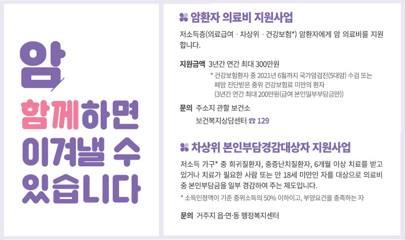 단, 지난 2021년 7월부터 의료비지원사업 개편에 따라 일반 건강보험 가입자는 신규 지원이 중단됐으나 예외적으로 2021년 6월 30일까지 국가암검진 수검 후 만 2년 이내 5대 암(위암, 간암, 대장암, 자궁경부암, 유방암)을 진단을 받은 경우 또는 2021년 6월 30일까지 폐암을 진단받은 경우에는 건강보험료 기준(22년 직장가입자: 110,100원 이하, 지역가입자: 104,500원 이하) 충족 시 급여 본인부담금에 한해 연간 최대 200만 원까지 지원이 가능하다.