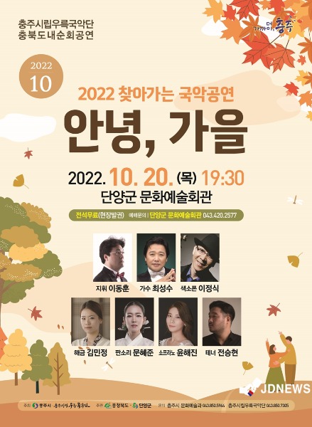 우륵국악단은 20일 오후 7시 30분 단양군 문화예술회관, 11월 4일 오후 7시 30분 제천시 문화예술회관, 11월 16일 오후 7시 30분 음성군 문화예술회관에서 공연할 예정이다.