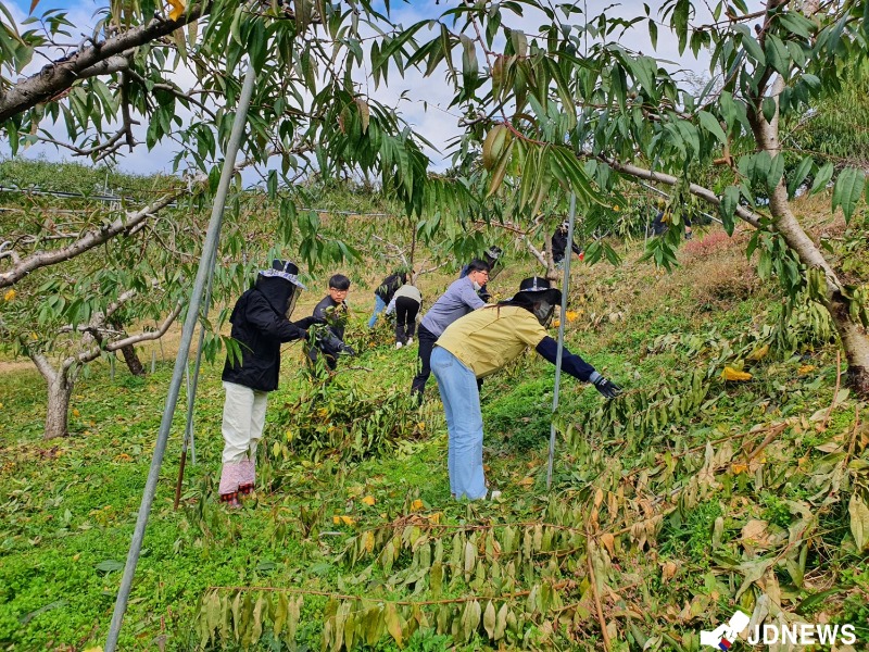일손돕기에 나선 일동은 1,200평 복숭아 과원 전지 목 수거와 과원 정리 작업에 힘을 보태며 구슬땀을 흘렸다.