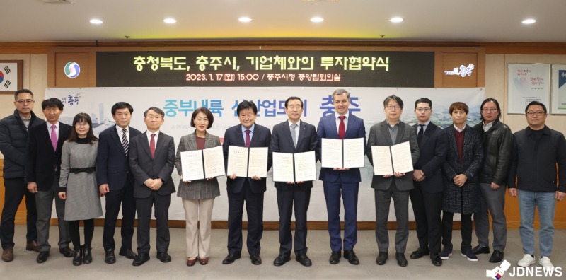 시는 충청북도와 함께 17일 충주시청 중앙탑회의실에서 ㈜에스앤에스 등 3개사와 1,381억여 원 규모의 투자협약을 체결했다.