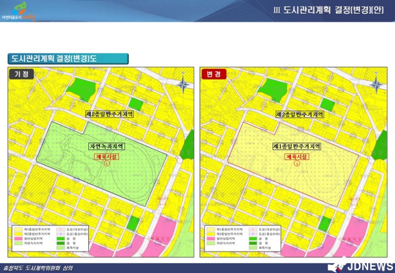 지난 19일 충북도는 ‘2023년 제1회 충청북도 도시계획위원회’를 열고 제천시 요청 원안을 수용했다. 시는 위원회에 제천체육관 주변 체육지설지역을 자연녹지 지역(건폐율 20%미만)에서 제1종 일반주거지역(건폐율 60%미만)으로 변경 결정을 요청했다.
