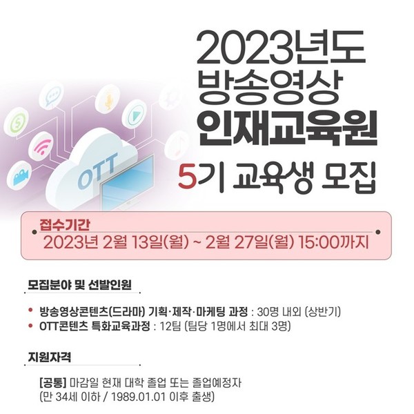 이번 교육생 모집 분야는 방송영상콘텐츠 기획·제작·마케팅 과정, 온라인동영상서비스(OTT) 콘텐츠 특화 과정이며, 서류와 면접 심사를 통해 다음 달 중 최종 합격자를 선발할 예정이다.
