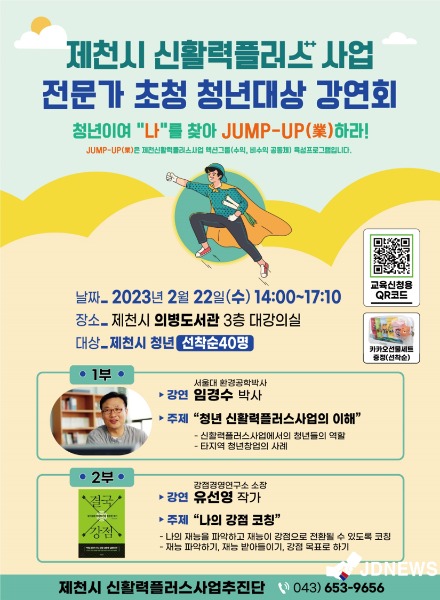 시는 사업 배경을 설명하고 지역청년들에게 참여 동기를 부여하기 위해 22일 설명회를 개최하고 참가자를 모집한다. 2시부터 임경수 서울대 환경공학박사가 신활력플러스 사업 및 타 지역 청년들의 사업 추진사례를 소개하고, 3시 40분부터 「결국, 강점」저자인 유선영 작가가 청년들에게 재능을 파악하고 강점을 이끌어낼 수 있도록 코칭프로그램을 강연할 예정이다. 당일 참여자에게 선착순으로 카카오프렌즈 여행용 키트도 배부한다.
