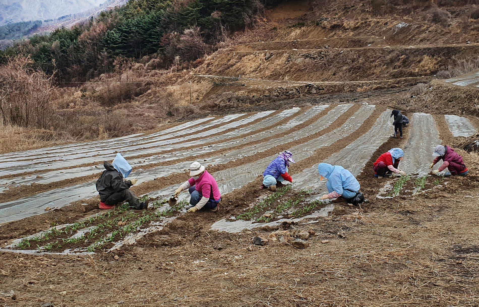 한지형 마늘은 10월 중순~11월 상순경에 파종하고 땅이 얼기 전 11월 중·하순경에 비닐 피복을 하여 겨울을 보낸다. 겨울을 지나 봄이 되면 마늘 싹이 올라오게 되는데, 이때 마늘 싹을 꺼내는 유인작업을 해야 한다.