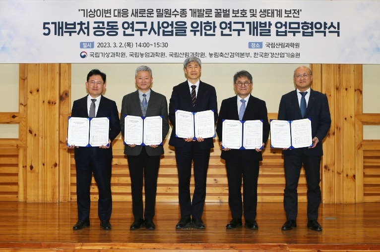 협약에는 국립산림과학원을 비롯해 농림축산식품부 농림축산검역본부, 환경부 한국환경산업기술원, 농진청 농업과학원, 기상청 국립기상과학원이 함께하였다.