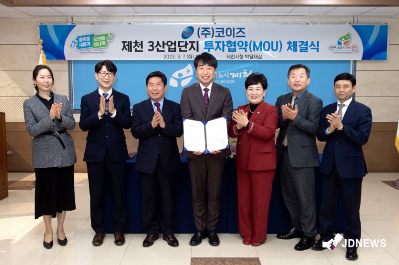 김창규 제천시장, 이정임 제천시의회 의장, ㈜코이즈 조재형 대표이사 등 8여명의 관계자가 참석한 가운데 투자협약을 체결했다.