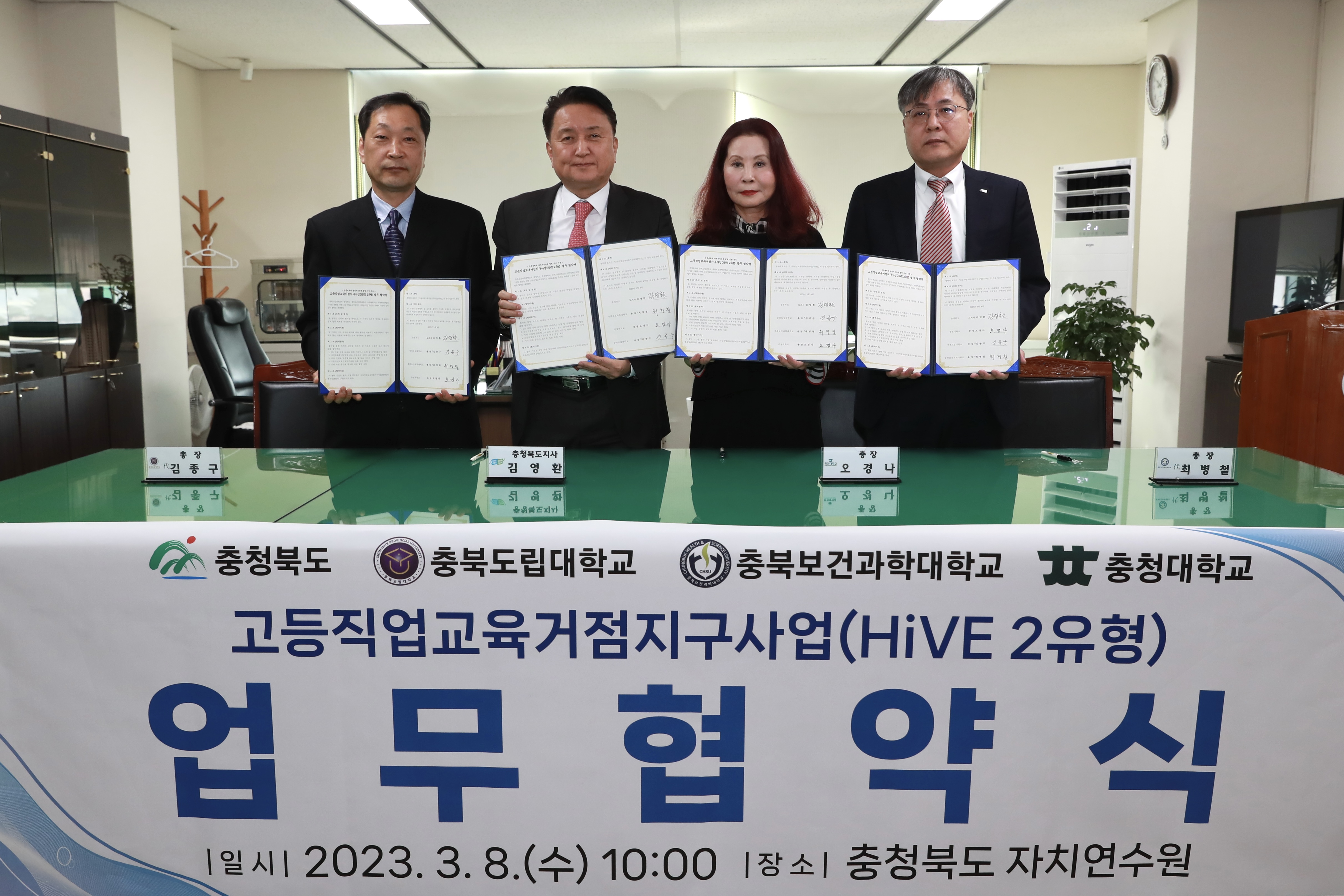 충청북도는 8일 오전 10시 충북자치연수원에서 김영환 도지사를 비롯해 충북도립대학교 김종구 총장 직무대리와 충청대학교 오경나 총장, 충북보건과학대학 최병철 총장 직무대리 등 관계자가 참석한 가운데 고등직업교육거점지구사업(이하 ‘HiVE’) 공동 추진 업무협약식을 가졌다.