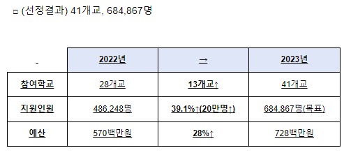 농림축산식품부(장관 정황근, 이하 농식품부)와 농림수산식품교육문화정보원(원장 이종순, 이하 농정원)은 3월 13일 ‘천원의 아침밥’ 사업 참여대학 41개소(총 목표 지원인원 684,867명)를 선정했다고 밝혔다.