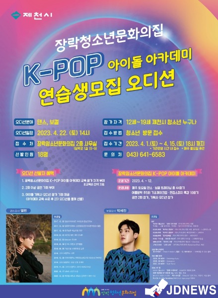 오디션은 지역 내 초등학교 5학년부터 고등학교 3학년까지 신청할 수 있으며, 오는 15일까지 장락청소년문화의집에 직접 방문해 신청서를 제출하면 된다. 오디션은 추후 22일 진행될 예정이다.