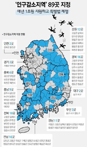 행정안전부는 공식적으로 89곳을 인구감소지역으로 지정했다.