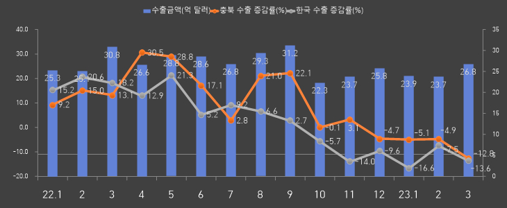 작년 하반기부터 심화된 글로벌 경기 침체와 반도체 시장의 수요감소 등이 지속됨에 따라 주력산업인 반도체 수출이 6.9% 감소하고, 그동안 충북 수출을 지탱해 온 편광필름, SSD, 필름류 등의 히든수출품목과 코로나 완화에 따른 진단키트 수출이 감소한 것이 주요 원인이다.