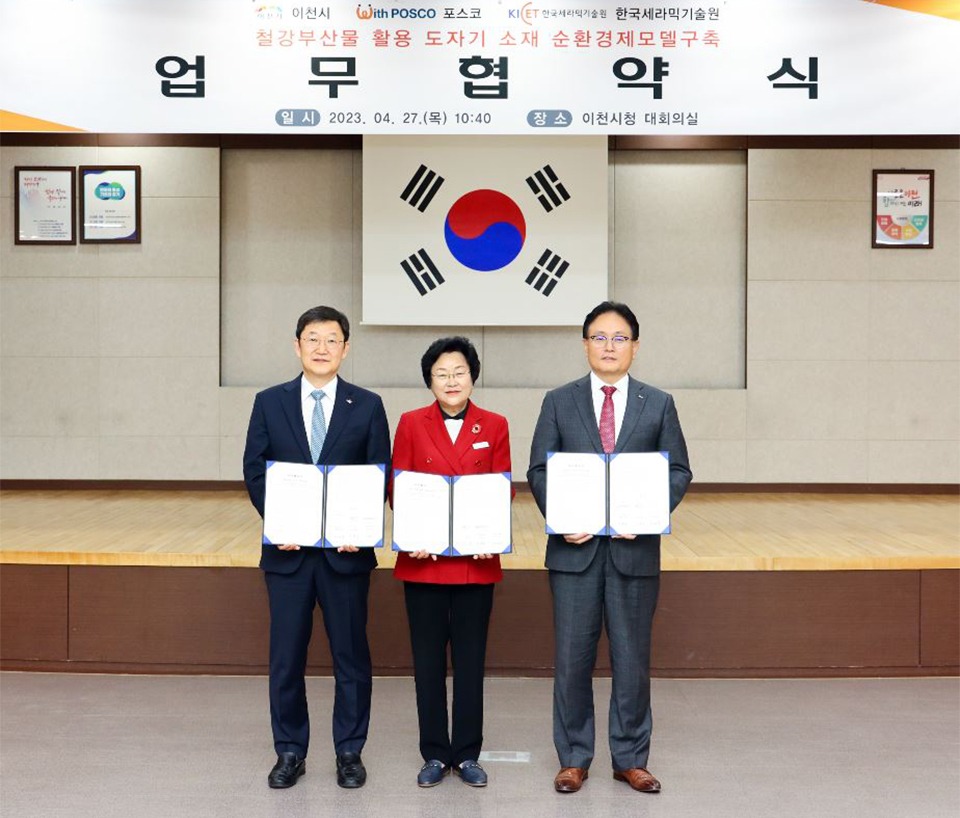 포스코는 27일 이천시, 한국세라믹기술원과 도자기 분야에서 소재공급 협력체제 구축을 위한 업무협약을 체결했다.
