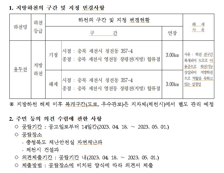지난 4월 18일, 충청북도는 공고 제2023- 569호를 통해 지방하천 용두천 하천 해제에 관한 주민 등의 의견 청취를 하겠다고 공고했다.