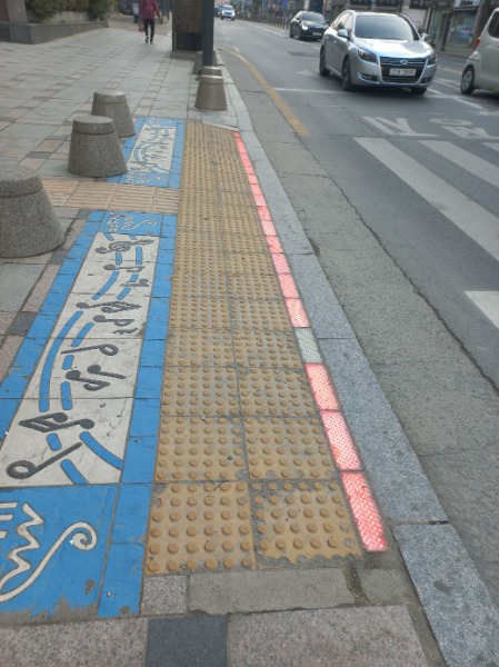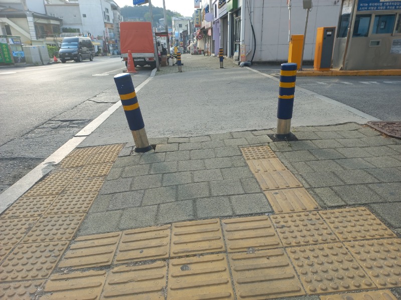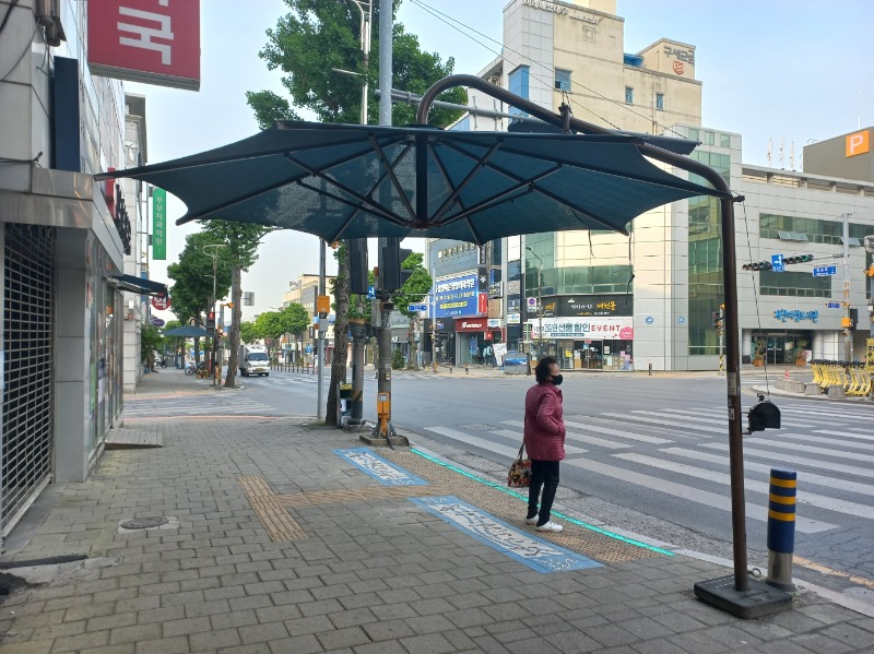 더위를 피하는 그늘막, 비오는 날은 우산이 걸린다. 바로 옆에는 가로수가 있다. 차라리 가로수를 잘 관리하는것이 좋아 보인다.시내 100미터를 걸어봐도 과도한 시설들이 여기저기 눈에 들어온다.