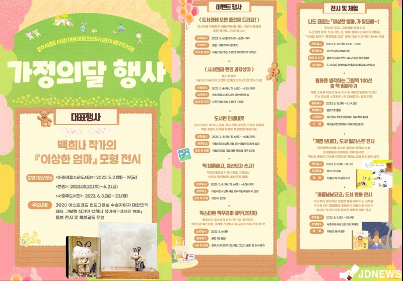 시 관계자는 “제1회 도서관의 날(4.12.)과 제59회 도서관주간(4.12-18.)에 도서관을 찾아주신 시민들에게 보답하고자 5월 가정의 달에도 의미 있는 행사를 가득 준비했다”며, “시민 여러분께서는 5월에도 도서관에서 가족, 친구들과 함께 즐거운 시간을 보내시길 바란다”고 말했다.