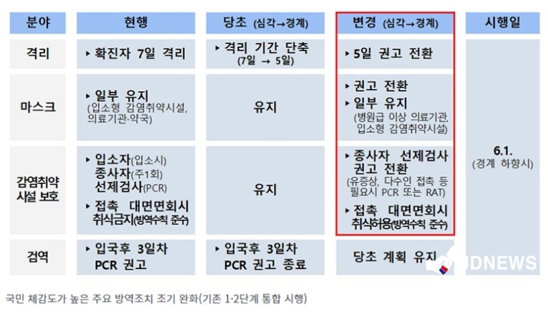 경계수준 하향으로 확진자 격리는 7일 의무에서 5일 권고로, 의원과 약국의 실내 마스크 착용도 의무에서 권고로 전환하는 등 국민 체감도가 높은 주요 방역 조치가 완화될 전망이다.
