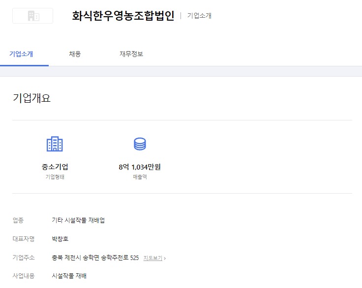 ▲ 워크넷에 공개된 화식한우 영농조합법인 정보