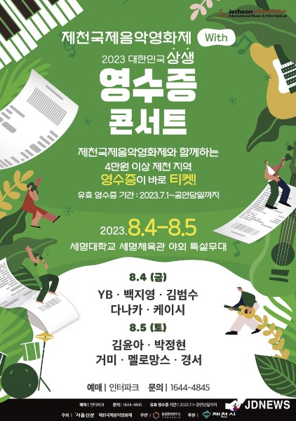 한편 이번 콘서트는 1일차(4일) 오후 7시 30분에 YB, 백지영, 김범수, 다나카, 케이시가, 같은시간 2일차(5일)는 김윤아, 박정현, 거미, 멜로망스, 경서가 제천국제음악영화제 성공을 기원하며 멋진 공연을 펼칠 예정이다.